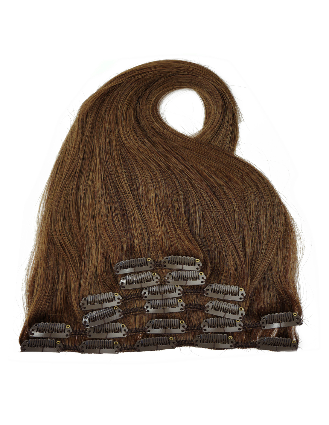 For a natural effect, the amount of clip-in hair should be similar to the amount of your natural hair. With a length of 50 cm, you will usually only need around 100 grams of hair, which is equivalent to one set of Clip In. See our tips for buying hair extensions.