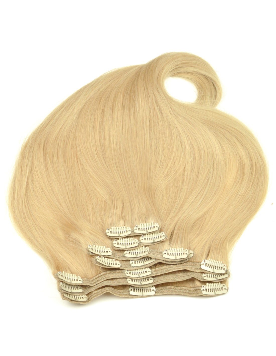 The Clip-In method involves attaching hair tapes to your own hair using clips. The clips are sewn onto the tapes and usually have a silicone cover to prevent them from slipping off your head.